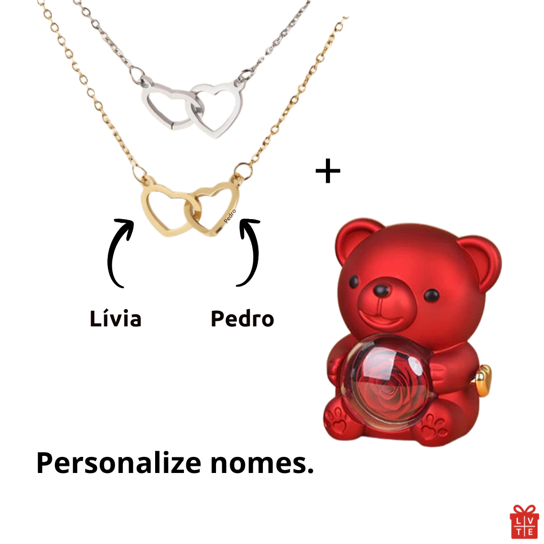 um urso premium em design exclusivo, que guarda em seu interior uma rosa giratória eterna, revelando delicadamente um colar de corações entrelaçados em aço inoxidável de alta qualidade, capaz de eternizar o nome de quem você ama.