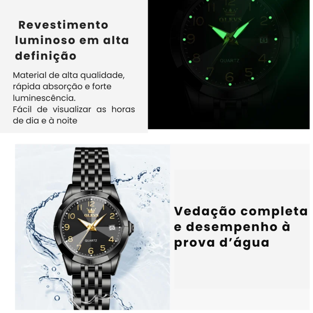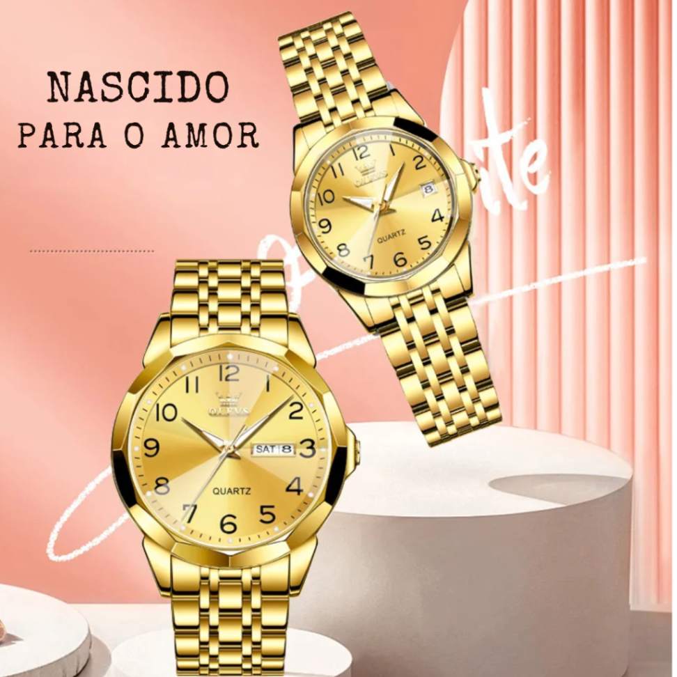 Com design elegante em aço inoxidável prateado com detalhes dourados, resistência à água e calendário completo, esses relógios unem funcionalidade e romantismo em cada detalhe.