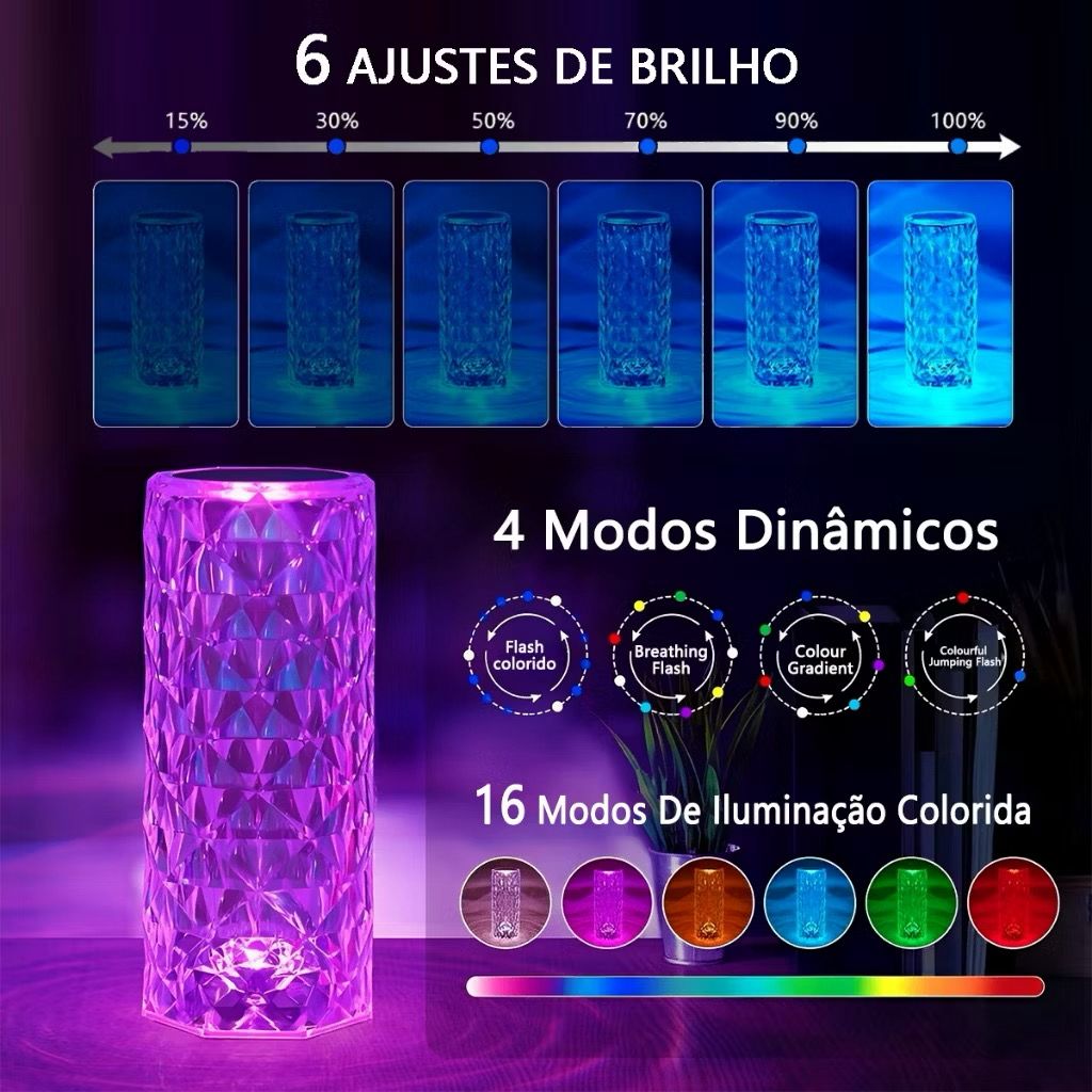 Possui toque sensível, controle remoto multifuncional, 16 cores de iluminação e 4 modos de efeitos de luz (flash, strobe, fade, suave). Totalmente recarregável via USB e com duração de até 8 horas, a AquaCristal é perfeita para momentos românticos, decoração premium ou presentes que encantam.
