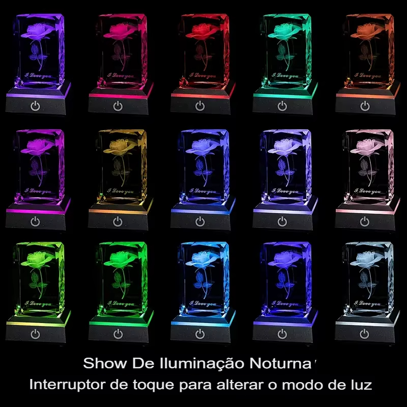 Com tecnologia de projeção óptica 3D e base sensível ao toque, a rosa parece flutuar em meio a um espetáculo de cores. Perfeita para decorar ambientes, encantar em datas especiais e eternizar momentos em luz.