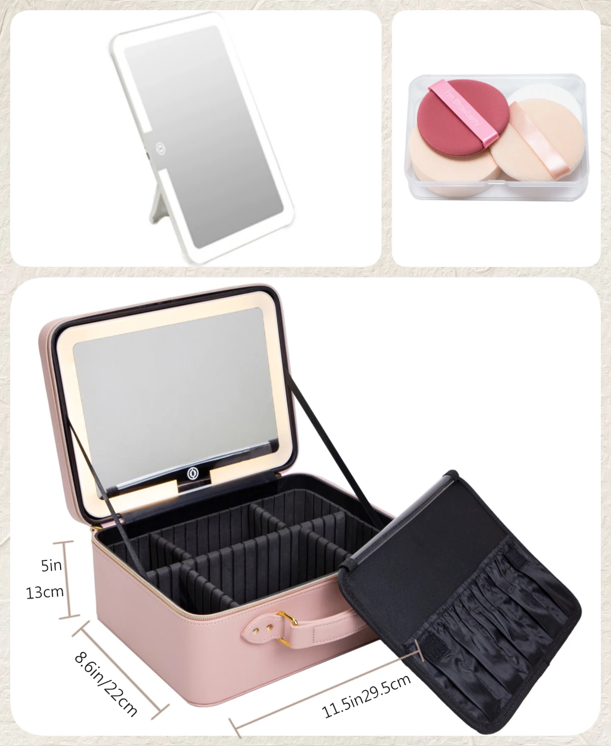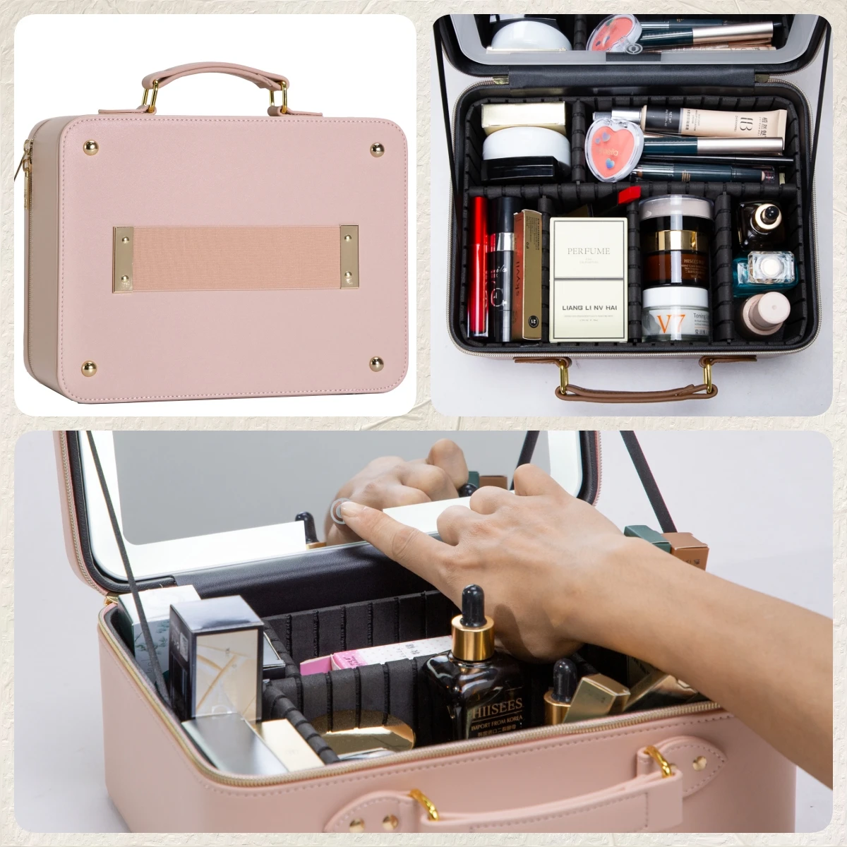 Equipado com espelho de LED integrado com ajuste de luz, esse estojo garante iluminação perfeita em qualquer ambiente – seja em casa, estúdio ou viagens.